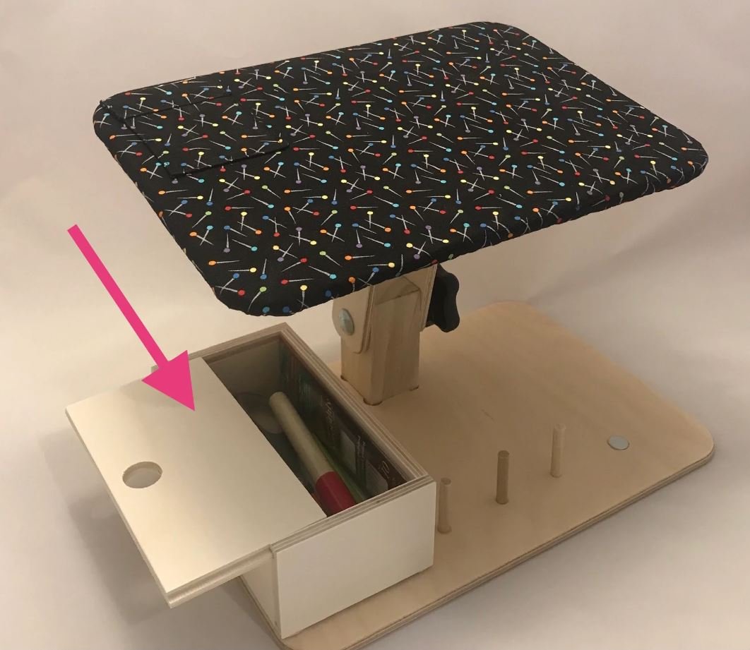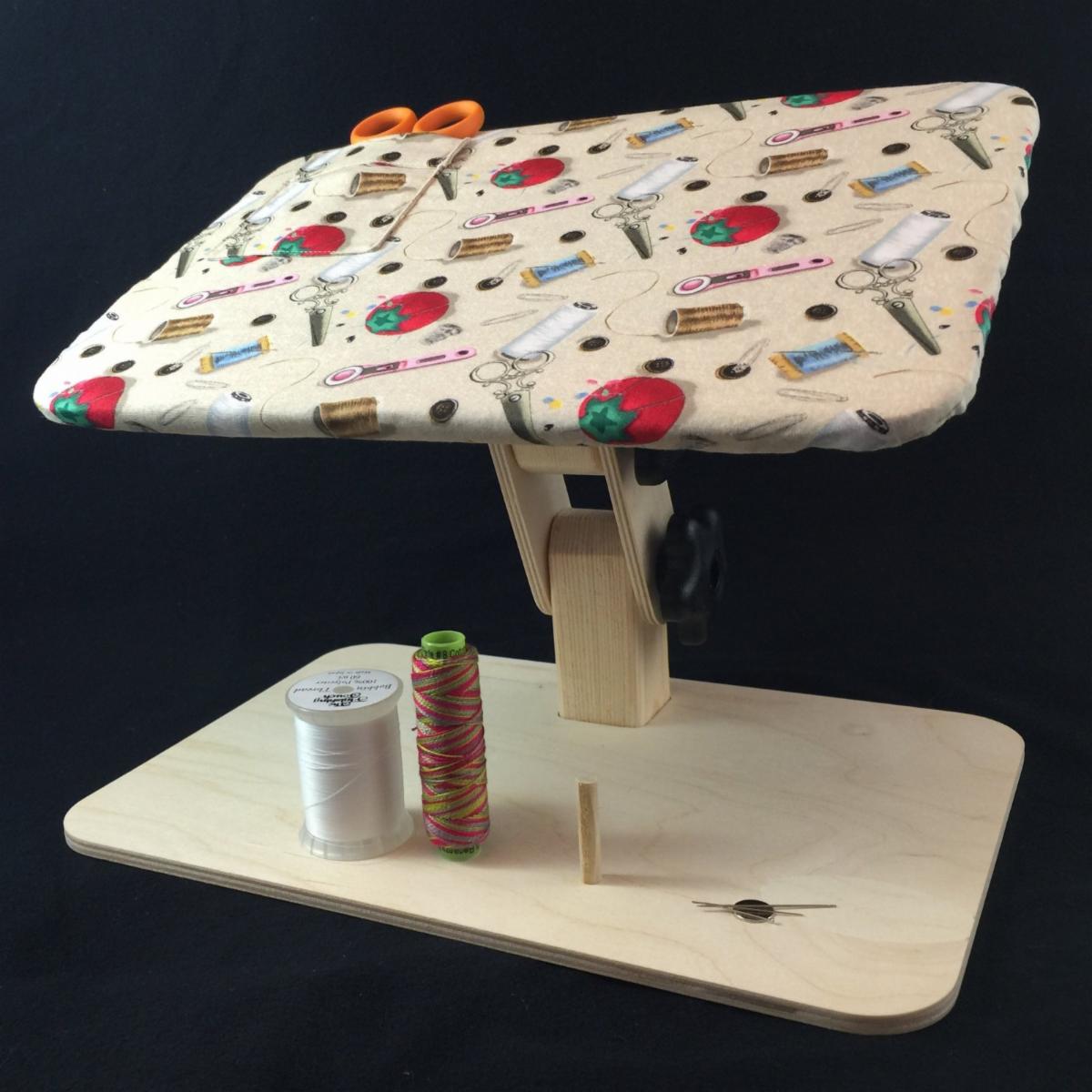 Each Lap App comes with a unique washable cover as well as a pattern to make your own replacement cover. The cover even has a little pocket in it for holding your scissors or seam ripper. The surface measures 12" x 8" and the height can be adjusted from 4" - 8".