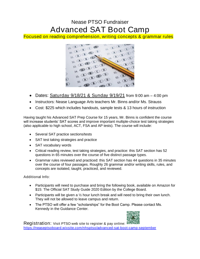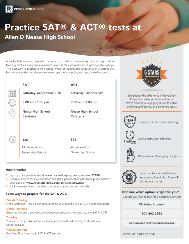 The School Advisory Council is a school-based group intended to represent the school, the community, and those persons closest to the students that share responsibility for supporting the school’s continuous improvement. Meetings will take place between 8 and 9 a.m. in the front office conference room. A virtual attendance link via Google Meet will be posted next week in the Panther Press and on the Nease SAC site.