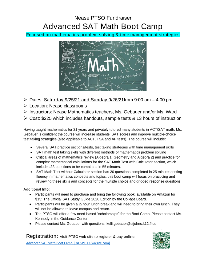 The first 21-22 Nease High School Advisory Council meeting will be held on Thursday, August 26th. The second meeting will take place on Thursday, September 23th. Thereafter, meetings will occur on the third Thursday of each month (except for March). All stake holders are welcome and invited to attend. If you would like to participate on SAC, please email Deanna.scheffer@stjohns.k12.fl.us.