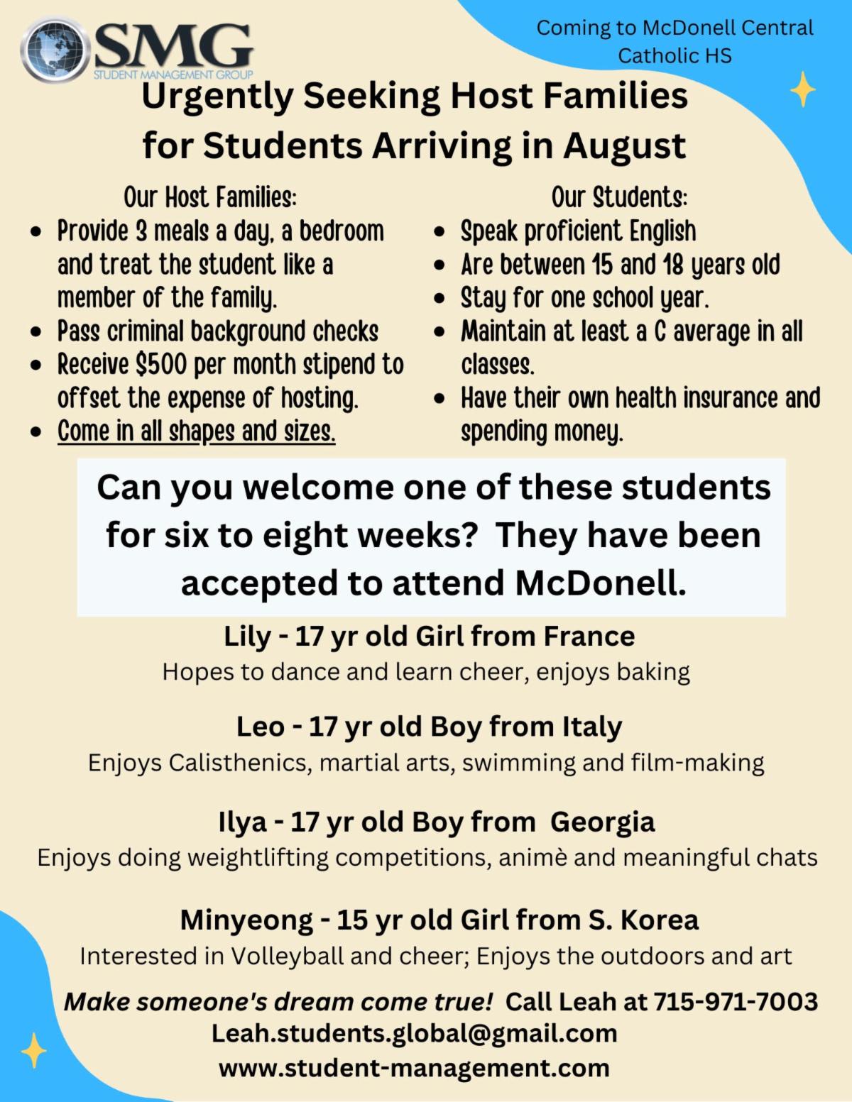To learn more about becoming a host family, reach out to Leah Christopherson with SMG or Mrs. Jimenez at school.