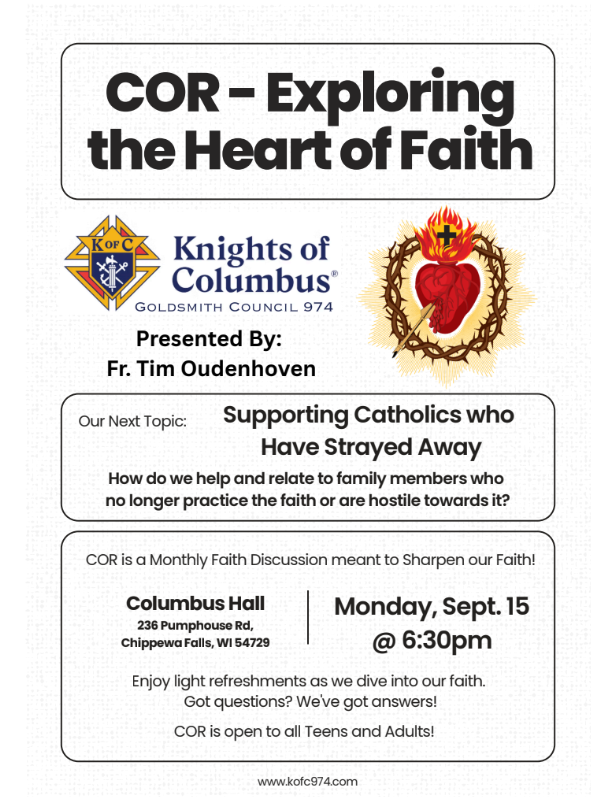 Join us for the next COR – Exploring the Heart of Faith, presented by Fr. Tim Oudenhoven and the Knights of Columbus. This month’s discussion, Supporting Catholics Who Have Strayed Away, will explore how we can help and relate to family members who no longer practice the faith or feel hostile toward it.