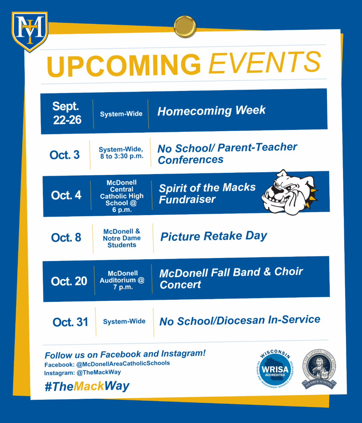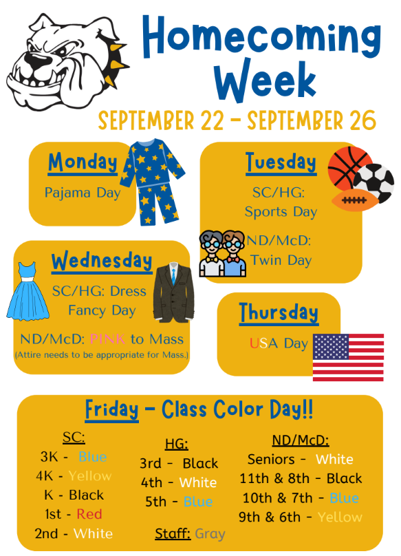Homecoming Week is next week! Get ready to show your school spirit September 22–26 with fun dress-up days happening system-wide. The week wraps up on Friday, September 26, with the Homecoming football game at 7 p.m. at Dorais Field—come cheer on the McDonell Macks!