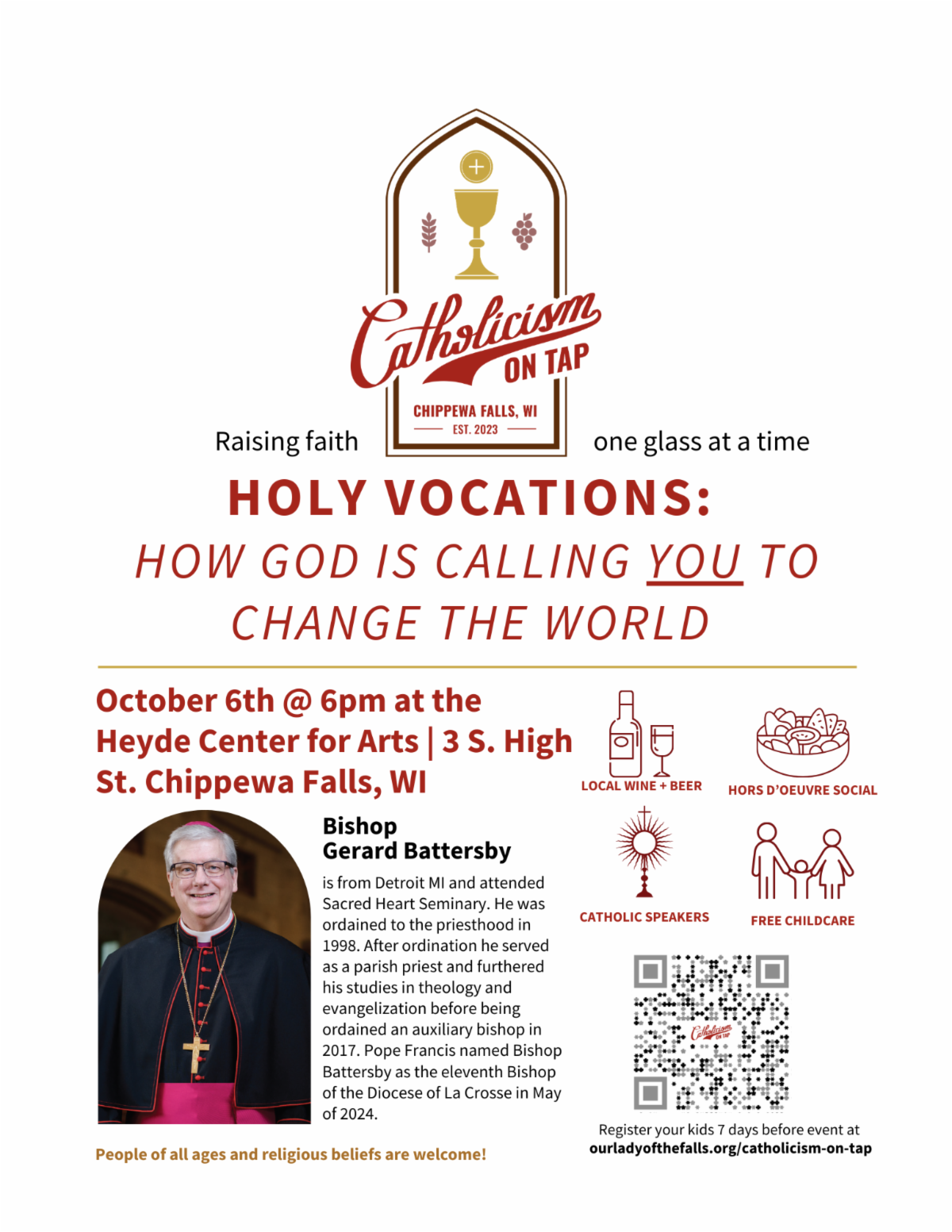 Bishop Battersby will present at the next Catholicism on Tap on October 6, speaking about YOU: "Holy Vocations: How God is Calling You to Change the World.