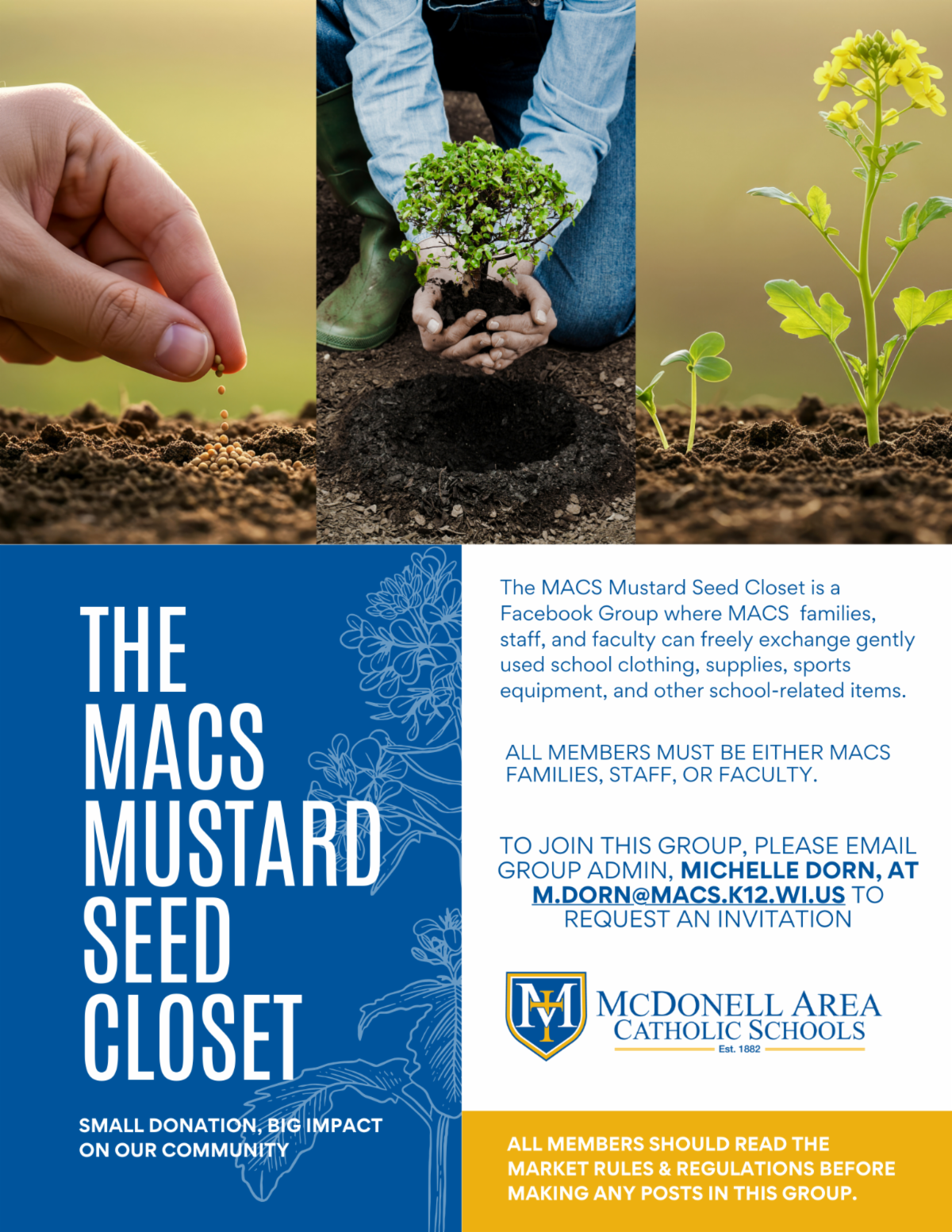 The MACS Mustard Seed Closet is a Facebook group where MACS families, staff, and faculty can freely exchange gently used school clothing, supplies, sports equipment, and other school-related items.