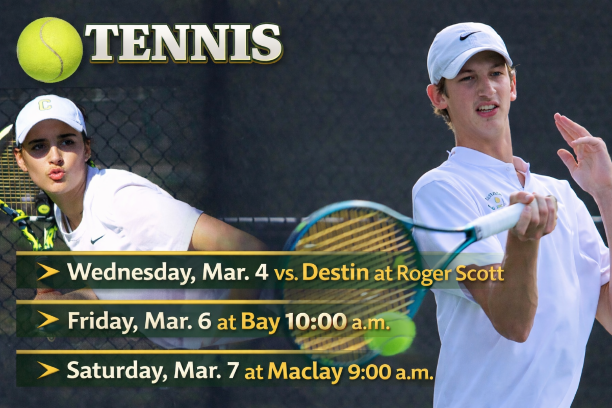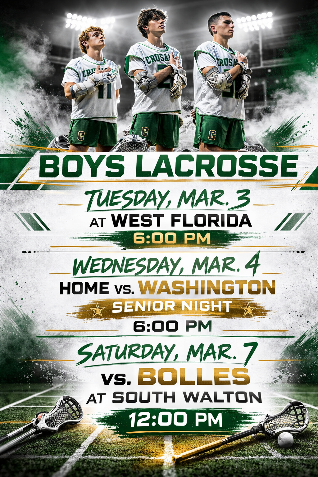 Saturday, Mar. 7--Baseball (Home) vs. St. Andrew's Episcopal (JV 12:00, V 3:00 p.m.); Boys Lacrosse at South Walton, 12:00 p.m.; Tennis at Maclay, 9:00 a.m.; Track & Field at Washington, 8:00 a.m.