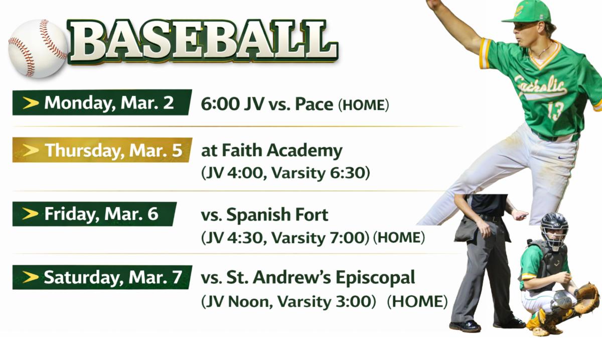 Friday, Mar. 6--Student Council Elections; Dismissal Times (12th 1:55 p.m., 9th, 10th and 11th 2:55 p.m.); Baseball (Home) vs. Spanish Fort (JV 4:30, V 7:00 p.m.); Girls Lacrosse (Home) vs. St. Pius Catholic, 5:30 p.m.; Softball (Home) vs. St. Michael Catholic, 6:00 p.m.; Tennis at Bay, 10:00 a.m.
