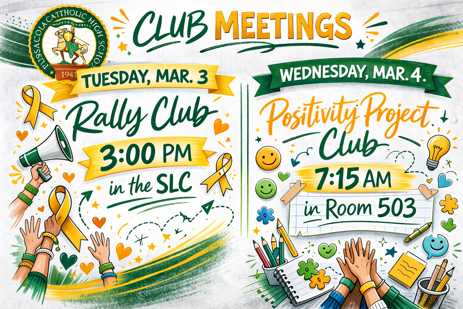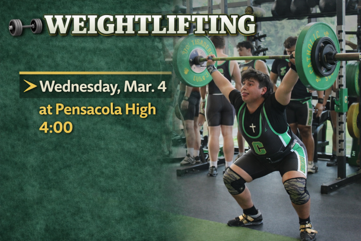 Wednesday, Mar. 4--Weightlifting at Pensacola High, 4:00 p.m.; Boys Lacrosse (Home-Senior Night) vs. Washington, 6:00 p.m.; Tennis vs. Destin at Roger Scott, 3:30 p.m.; St. Boniface Society College Fair; University of Southern Miss Visit; Student Council Speeches; Chicken Biscuit Day; Positivity Project Club Meeting