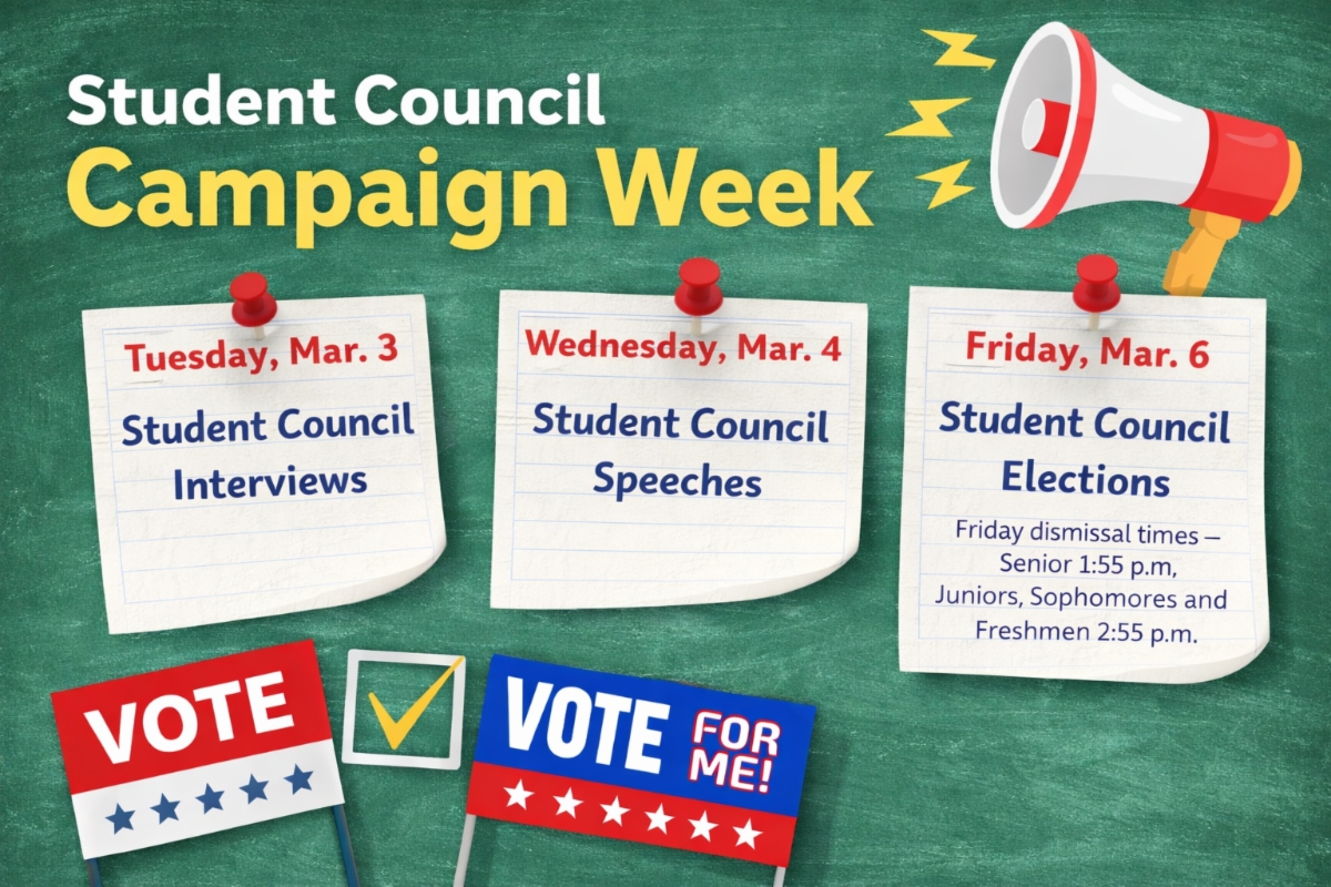 Student Council Campaign Week is here! This Friday we will elect our Student Council leaders for the 2026-27 school year. This is an important opportunity for our students to practice leadership, service to others, public speaking, responsibility, and civic engagement within our school community.