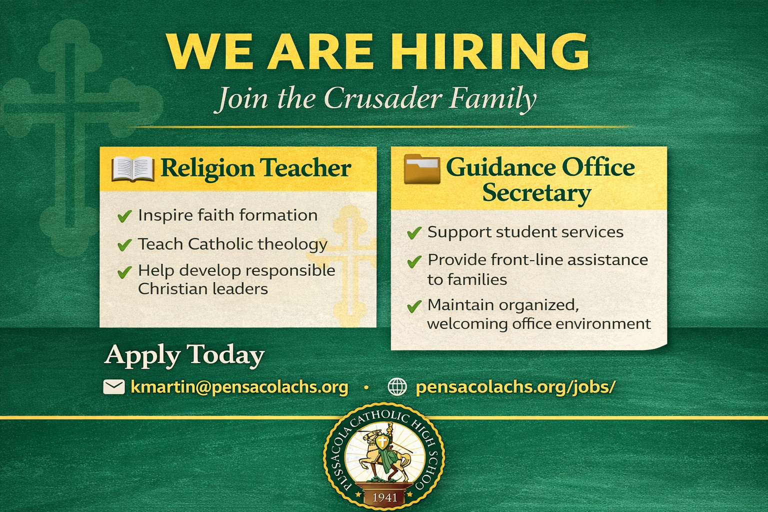 We also have an opening for a full-time Religion teacher for the 2026-27 school year. Applicants must be practicing Catholics and have at least a bachelor’s degree, preferably in theology or religious studies. For more information, please contact Sr. Kierstin Martin at kmartin@pensacolachs.org. To apply, please follow the steps described on our website. Applicants must also must pass all required fingerprinting and background checks as required by the Diocese of Pensacola-Tallahassee and the State of Florida.