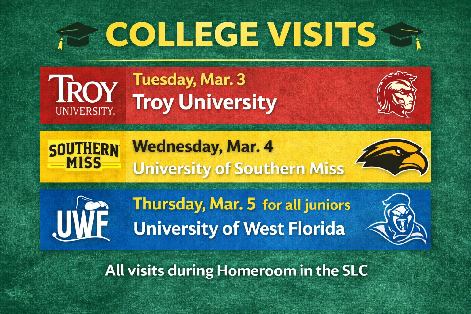 Tuesday, Mar. 3--Softball at Baker, 6:00 p.m.; Girls Lacrosse (Home) vs. Tate, 5:30 p.m.; Boys Lacrosse at West Florida, 6:00 p.m.; Student Council Interviews; Troy University Visit; Rally Club Meeting