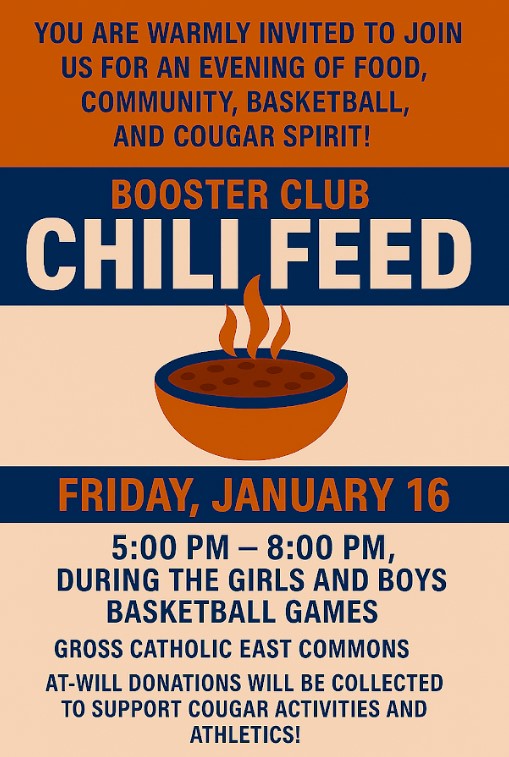 | | Athletics & Activities News | | Please consider donating your time, or an item of food or drink for the booster club sponsored chili feed. This will be held during the girls and boys basketball games on Friday January 16. JV boys game @ 4:30, Varsity girls @ 5:45, and Varsity boys @ 7:15. | | |