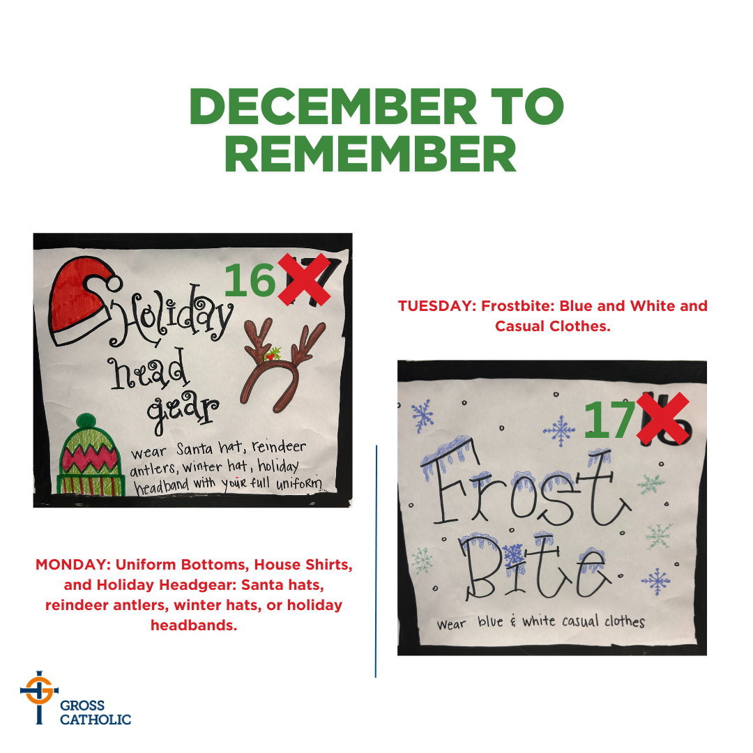 Tuesday, Dec 17 - Frost Bite Day (wear blue and white casual clothes)