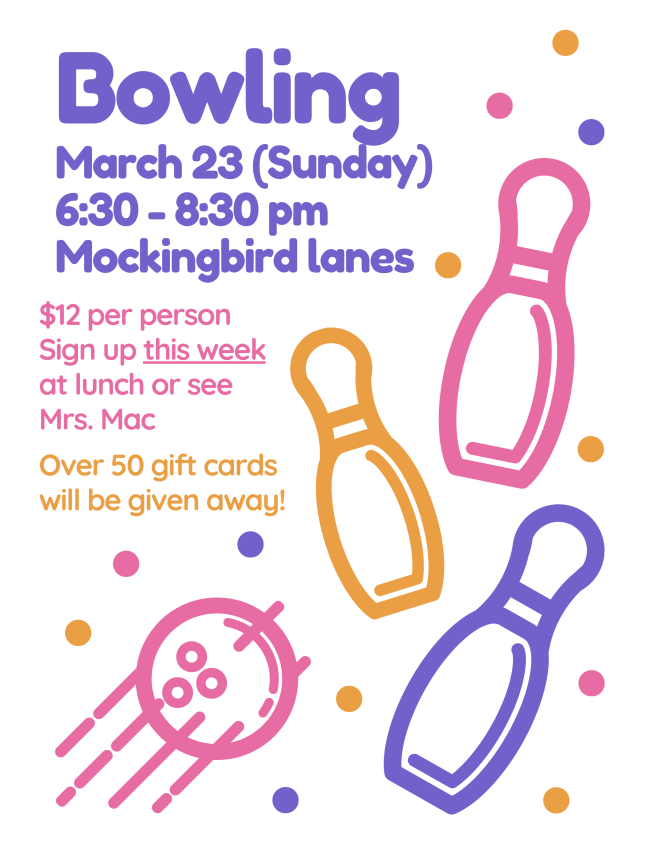 Sunday, March 23 - 6:30pm Bowling at Mockingbird Lanes