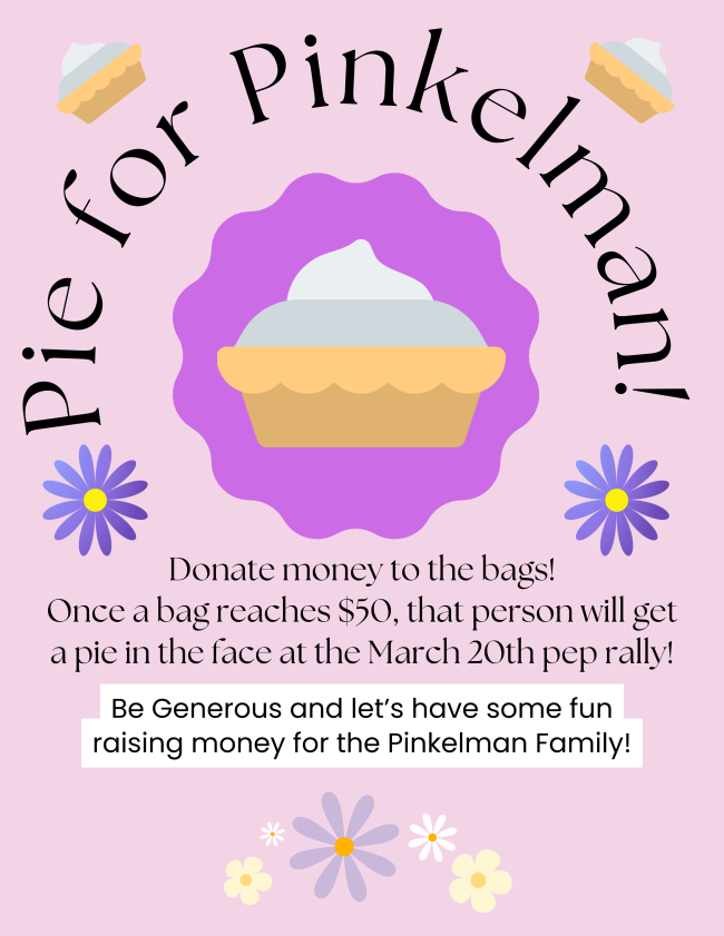 Student Council is organizing a fundraiser for the Pinkelman family. Teachers/Administrators/Seniors have volunteered to take a pie in the face at the March 20th pep rally. Students are asked to donate money to bags with the names of the volunteers. Once a bag reaches $50, that person will get a pie in the face! Please encourage your student to bring a donation to school! Any amount is welcome! Our prayers continue for the Pinkelman family.