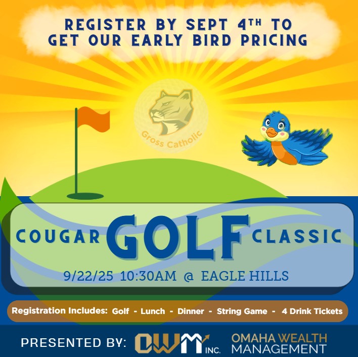 Each year the Cougar Classic brings together the Gross Catholic community for a day of fun, fellowship, and friendly competition while raising funds to support our students. On September 22nd we will gather for golf, fun games on various holes, lunch and dinner, drinks, raffles, and plenty of prizes.