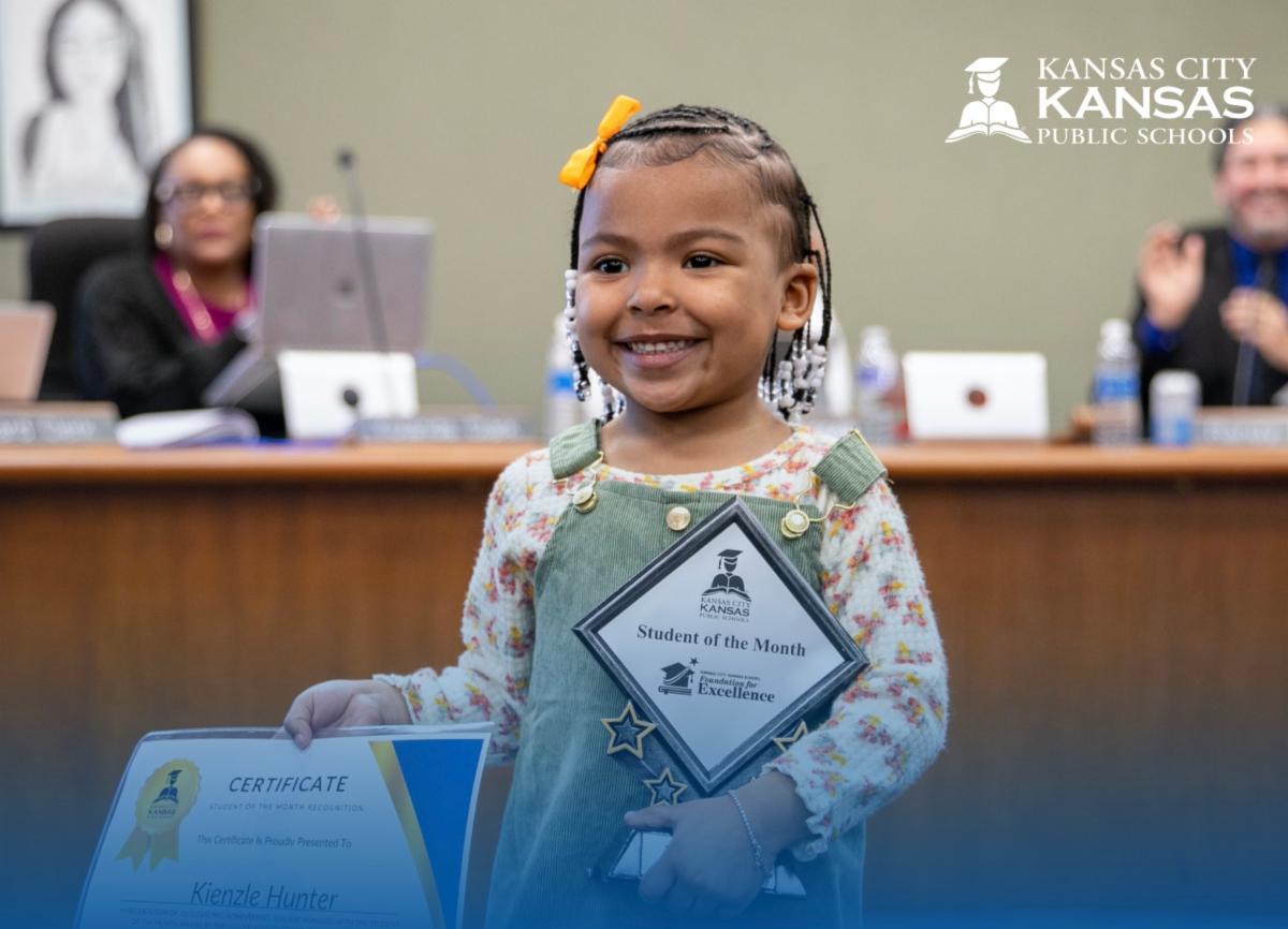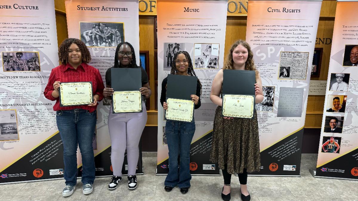 Neveah Williams, Ellie Jones, Canise Frazier, and Mariah Moseby were honored at the Kansas City, Kansas Public Schools board meeting on Thursday, February 27, for their collaboration with Kansas City Kansas Community College (KCKCC).