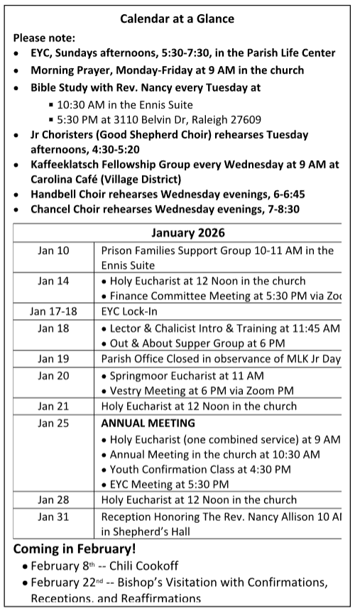 Please mark your calendars for a reception to celebrate Rev. Nancy on Saturday, January 31st from 10 AM until Noon in Shepherd's Hall. If you would like to contribute food items for the reception or help in any way, please contact Molly Propst (mvpropst@gmail.com OR 919.523.9142).