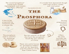 ПРОСФОРА (грч: προσφορά - принос), хлеб са квасцем од пшеничног брашна, воде и соли, који се приноси као евхаристијска бескрвна жртва; у Православној Цркви, хлеб који се освећује у Литургији, а средишњи део који се вади на Проскомидији - Агнец, постаје призивом Светог Духа Тело Христово; после промене у Тело Христово, заједно да вином које је такође дејством Светог Духа постало Крв Христова, дели се вернима у току Причешћа;који су на горњој страни обележени печатом - квадратом с крстом у средини и монограмом међу крацима крста: ИС ХС НИ КА (Исус Христос побеђује).