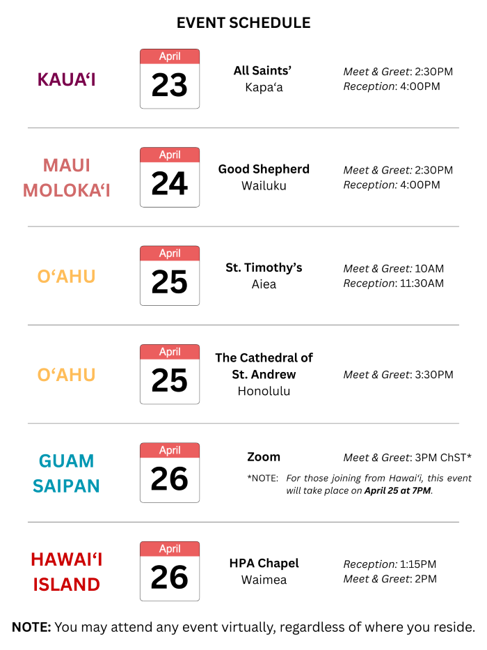 Now that the Search Committee has successfully completed its task, the work of the Transitions Committee takes front and center. From April 23 - 26, 2026, folks will have a chance to meet and engage directly with the candidates for the Sixth Bishop of the Episcopal Diocese of Hawai'i, through Ke Aloha Kākou Meet & Greets. These gatherings are holy conversations where clergy and laity can come together to hear, reflect, participate, and pray. For those who are unable to attend in person, the gatherings will be livestreamed and/or available via Zoom, with the ability for participation via Zoom chat or phone.