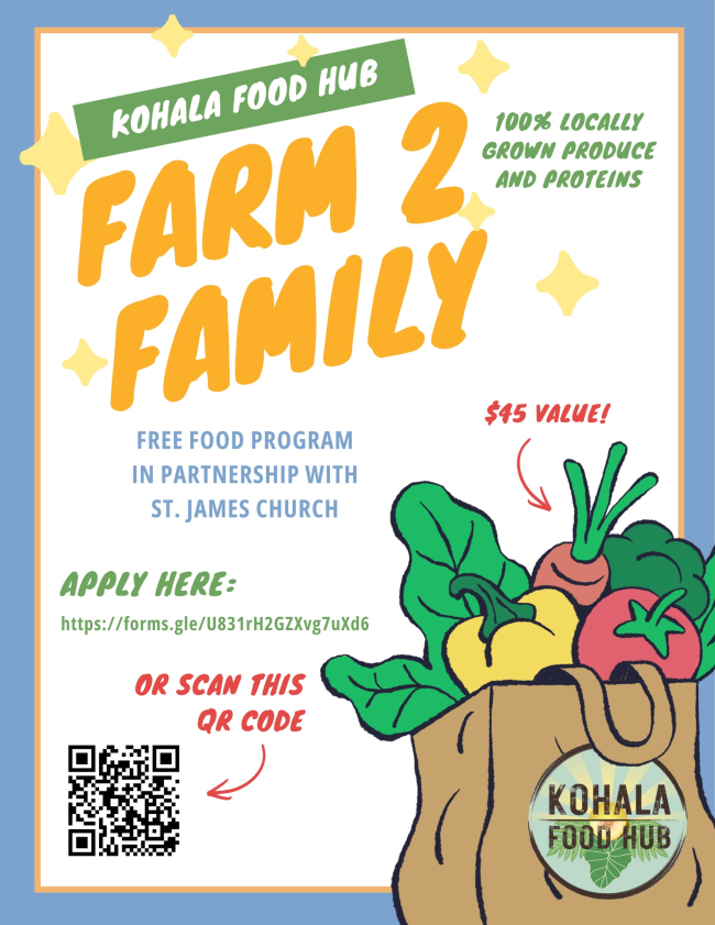 We will partner with Kohala Food Hub to distribute food boxes for up to 50 families, for 10 weeks from February 27 onwards. Please share this opportunity in your community! Applications are being accepted online here