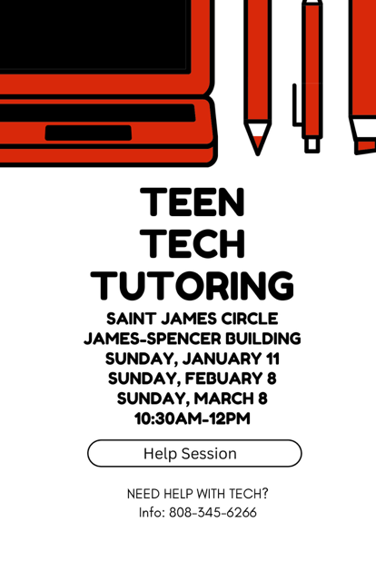 | | This week Teen Tech will be back onsite after the 9:30 service January 11 at St James'. Come by the Spencer building to have all of your tech mysteries solved. The St. James' Youth will be meeting as usual at the Spencer building from 3-6pm. Depending on if there is still snow up on the mountain, we may go up to build snow(wo)men and celebrate any of the glorious white treasures that God left for us to enjoy. Contact Josh at 808-937-0646 for more information. | | |