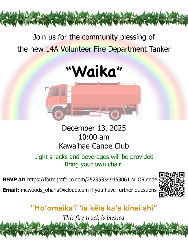The Waimea Community Meal has been chosen as the beneficiary of the 65th Annual Waimea Christmas Parade. We have the special opportunity of running this year’s Bucket Brigade, collecting donations from the crowd to support the Meal. The Parade is on Saturday, December 6th.