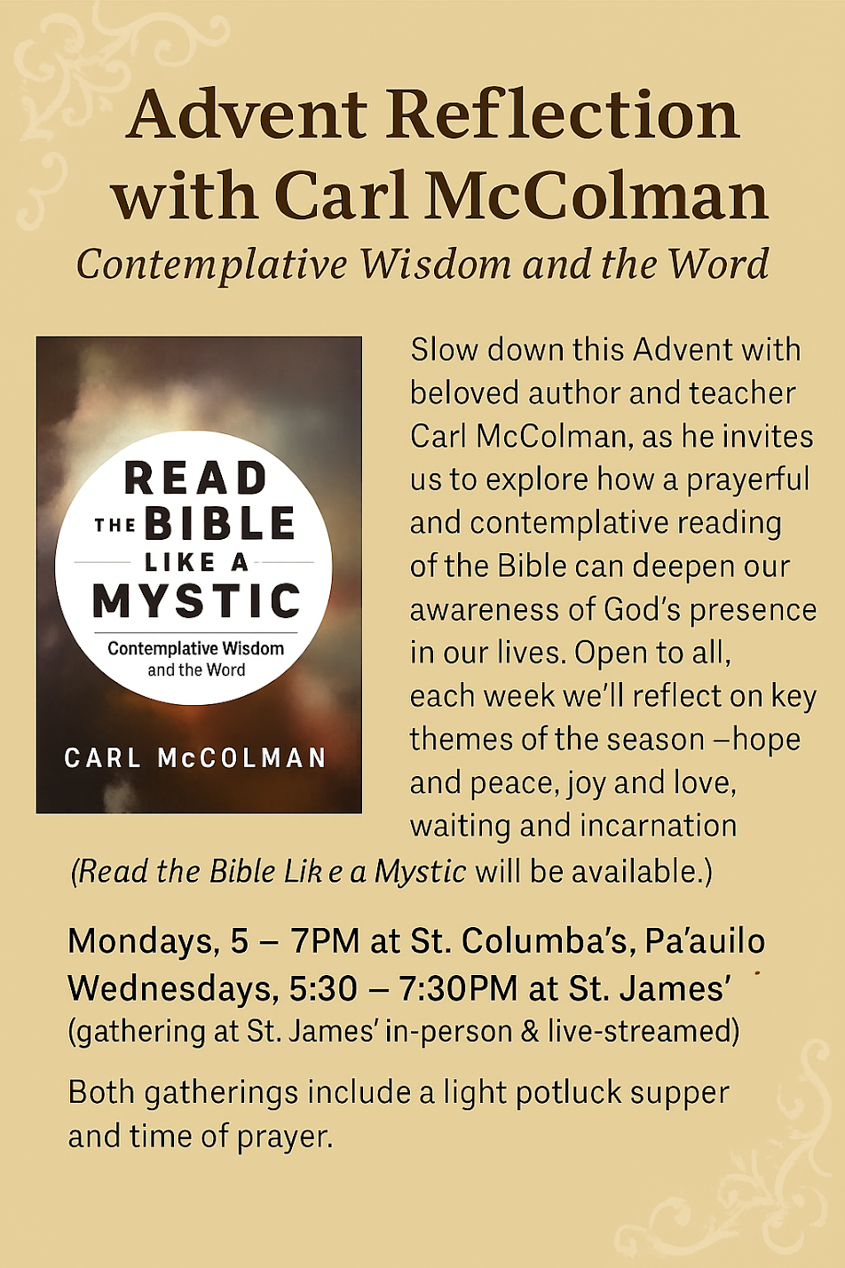 We welcome retreat leader and Christian mystic, Carl McColman, our Advent Speaker. Carl will be offering the homily at both morning services.