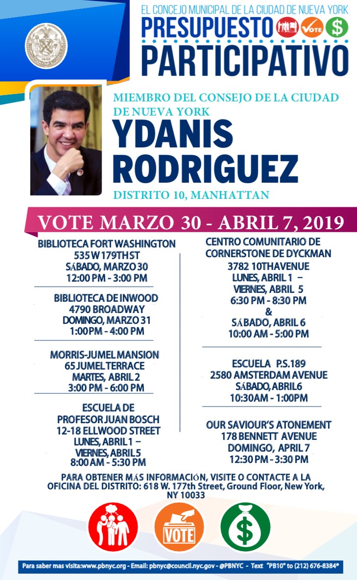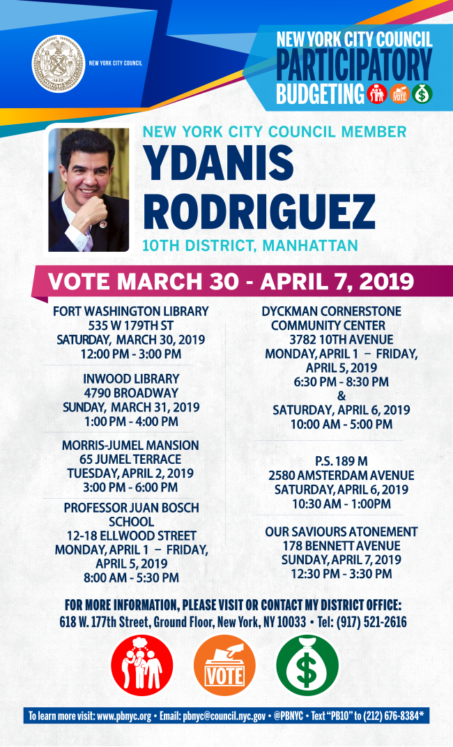Participatory Budget Vote Week starts today! I'm excited to get your input on how a million dollars will be spent in our community. I invite you to kick off with us this afternoon at The Fort Washington Library from 12pm-3pm.