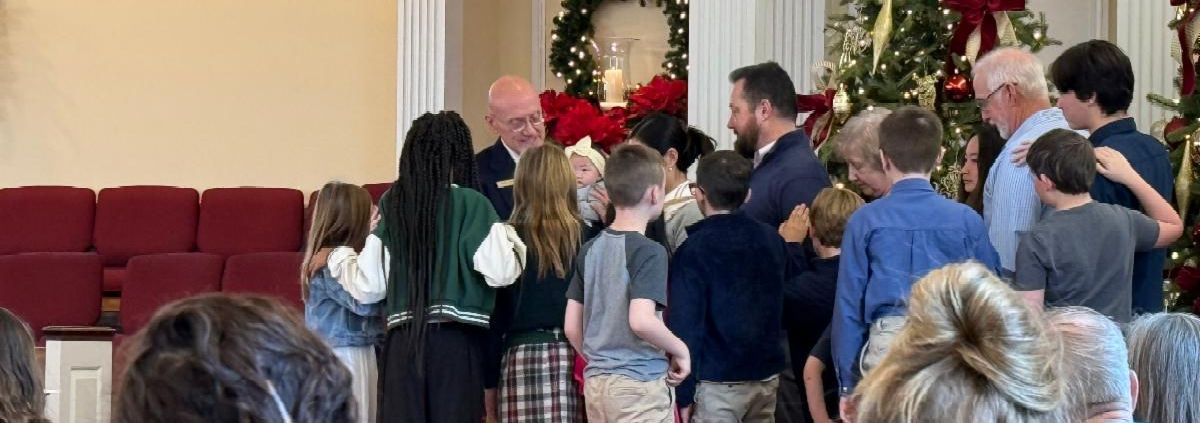 On December 28, a baby was dedicated at Wilmore Free Methodist Church. Pastor Darryl Diddle invited all of the children in the congregation to join the family at the front of the sanctuary for the ceremony. When it was time for the prayer of dedication, he invited the children to stand and place their hands on him or on a family member so that they could participate in the prayers for the baby.