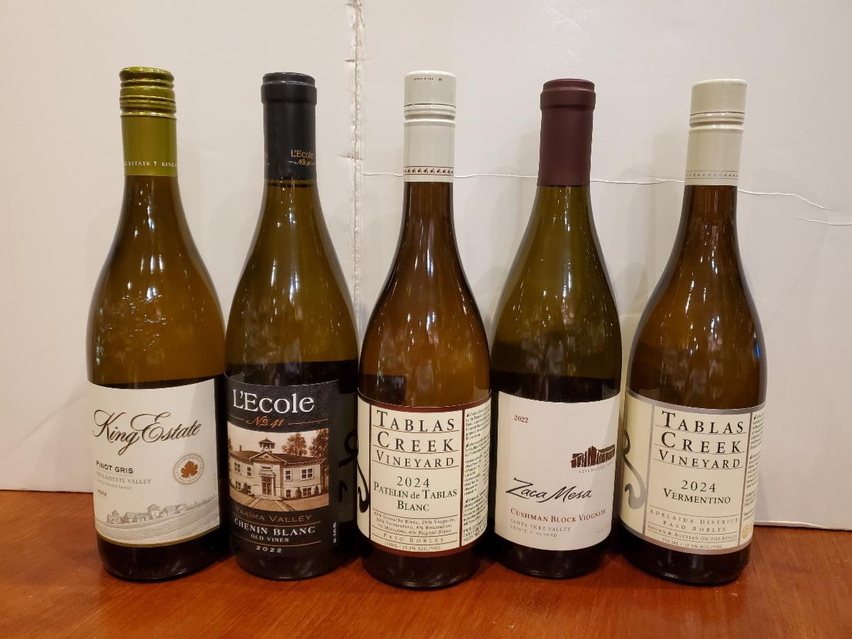 2022 King Estate Pinot Gris (Willamette Valley),2024 Tablas Creek Vermentino (Paso Robles), 2022 Zaca Mesa Viognier (Santa Ynez Valley), 2023 Curran Grenache Blanc (Santa Barbara County), 2024 Tablas Creek Patelin de Tablas Creek (Paso Robles), 2022 L'Ecole #41 Chein Blanc (Yakima Valley)