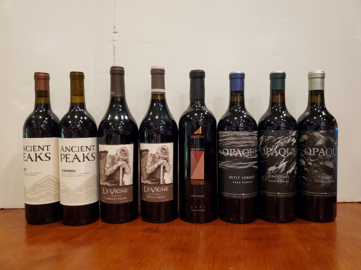 2021 Justin Isosceles, 2021 Opaque Tannat, 2021 Le Vigne Cabernet Franc, 2021 Ancient Peaks Merlot, 2019 Opaque Petit Verdot, 2019 Ancient Peaks Petite Sirah, 20221 Opaque Zinfandel, 2022 Ancient Peaks Zinfandel