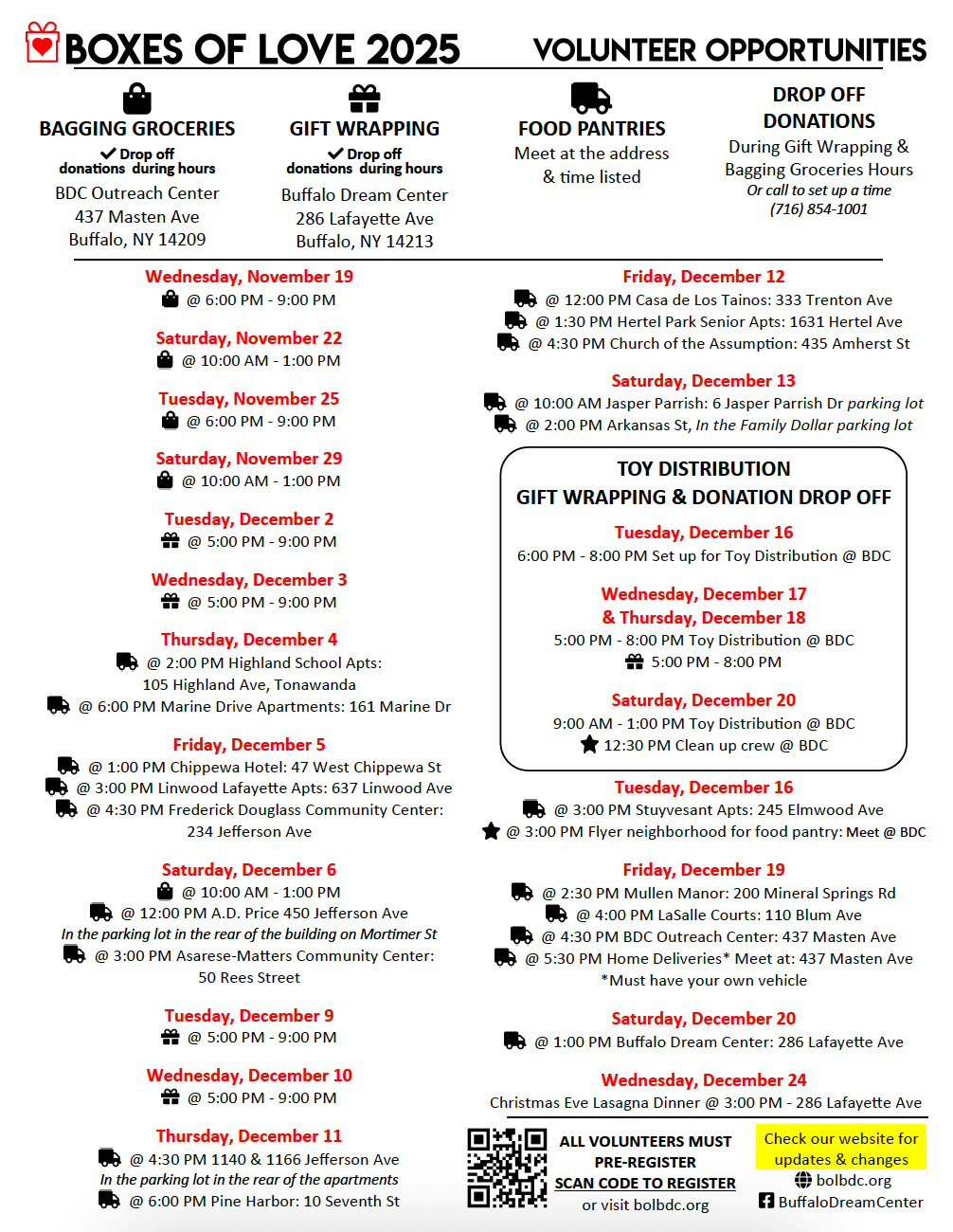 Everyone can get involved in gift wrapping, packing bags of food and distributing Boxes of Love to families in need. All of the important links are on the home page of our website. The links are also below. Signing up you and your family to volunteer is easy online. If you want to bring a group from your church or organization, please contact us so that we can put you in the schedule.