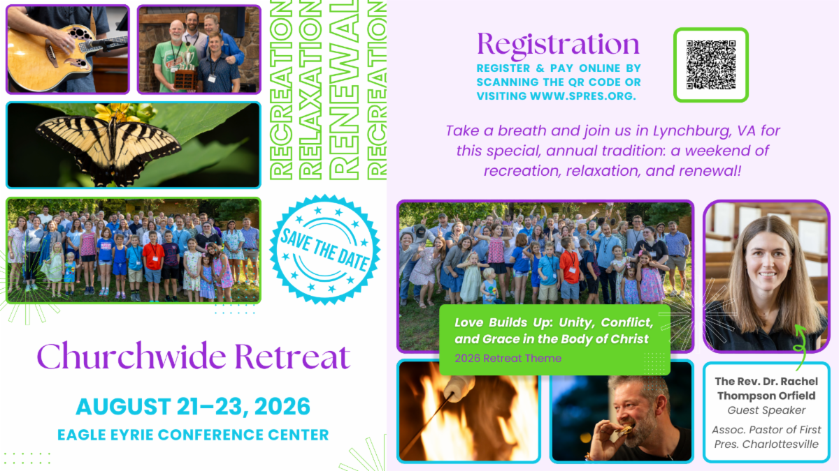 Join us August 21–23 at Eagle Eyrie in Lynchburg for our annual churchwide retreat! You won’t want to miss this intergenerational opportunity for spiritual growth and renewal. The retreat begins with dinner on Friday, and ends following mid-morning worship on Sunday. Our guest speaker for the retreat is the Rev. Dr. Rachel Thompson Orfield, Associate Pastor of First Presbyterian Church in Charlottesville.
