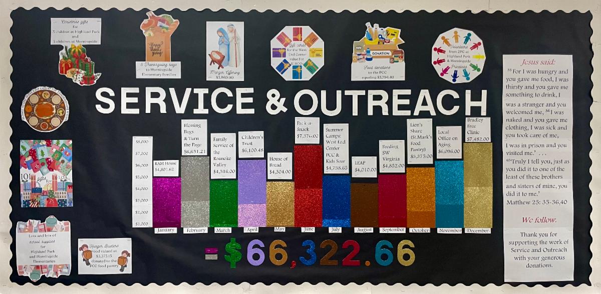 I was so struck by the board she decorated this past week that I decided to write about it here. This one celebrates the generosity of our congregation. You see the impact of the Outreach Offering—what we once called “Loose Plate/Change”—now directed toward specific projects. It also highlights other expressions of generosity: food bags assembled, gift cards shared, volunteer hours given. And all of this stands alongside the ministries supported through our budgeted benevolences and designated funds.