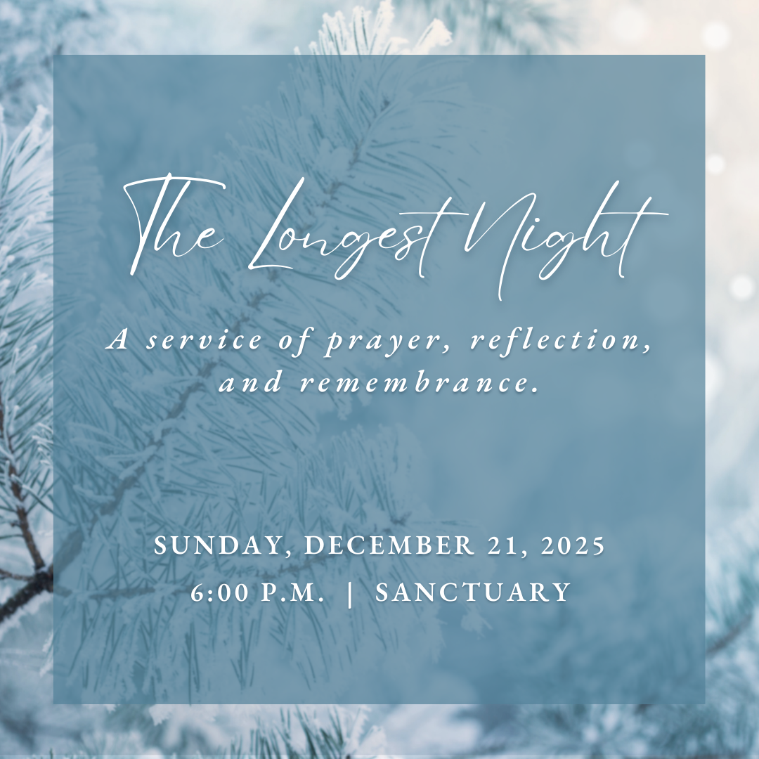 On Sunday, December 21 at 6:00 p.m. in the Sanctuary, we will hold a Longest Night service of prayer, song, and meditation. Our hope is that this worship service will create a safe and sacred space for those who are struggling to feel the joy and light of this Advent and Christmas season due to loss of any kind.