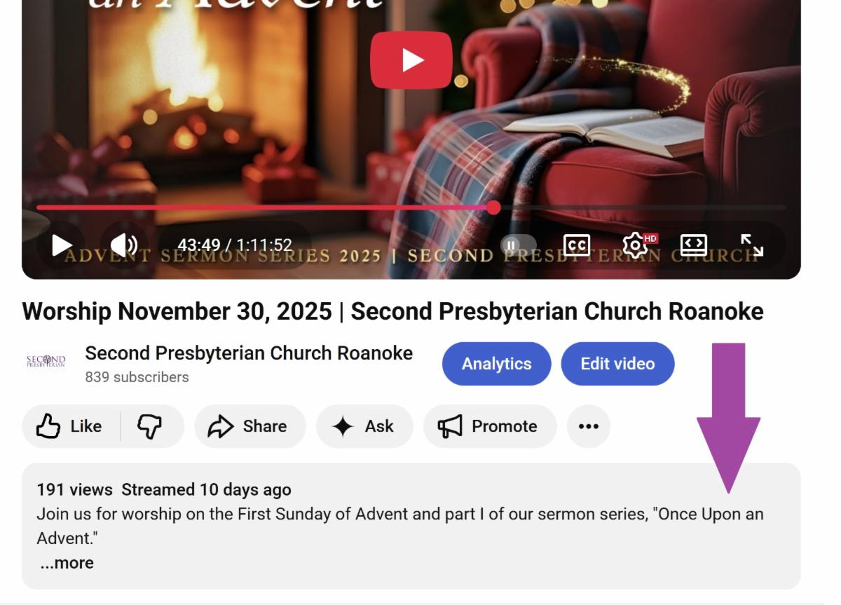 We also posted notices on the live stream page of the church website and in the YouTube video description (example shown below). As a reminder, we typically begin streaming about eight minutes before the hour. If it’s 11:00 a.m. or later and the stream hasn’t started, please try refreshing the page to check for any updates.