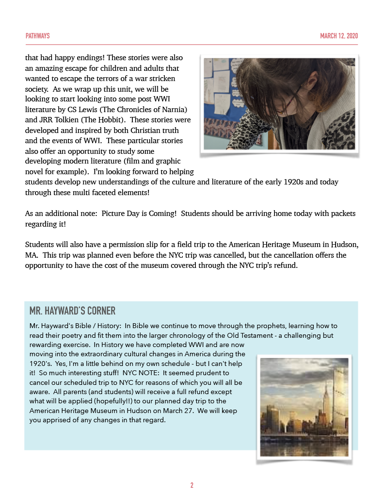 - We are (even more sadly) canceling our Open House with Clare Walker Leslie for this coming Thursday, March 19. This would have been one of the highlights of the year (second only to the Chicago World's Fair!) for our school and surrounding community. We will make every effort to reschedule her for some future date.