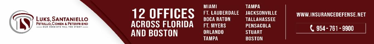 Our verdicts tell the story.™ Luks, Santaniello, Petrillo, Cohen & Peterfriend is a Massachusetts and Florida Corporate & Insurance Defense Litigation firm. The firm defends professionals, corporations and their insurance companies from both Liability and Workers' Compensation claims. From our twelve offices in Boston, Massachusetts and Florida in Key West, Miami, Fort Lauderdale, Boca Raton, Stuart, Fort Myers, Tampa, Orlando, Jacksonville, Tallahassee and Pensacola, the firm’s 190 attorneys deliver counsel and legal services in over 33 practice areas. The firm has several strategic and innovative practice areas including a dedicated Time and Policy Limit Demands and Tenders Practice Group, a Surgical LOP Abuse Practice and an SIU Fraud Special Investigations Practice that handle a number of specialized issues. Members have tried over 200 cases in Florida State and Federal Courts.