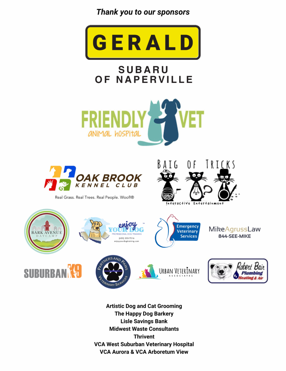 Thank you to our amazing sponsors: Gerald Subaru of Naperville, Friendly Vet, Oak Brook Kennel Club, Baig Of Tricks Entertainment, Bark Avenue Daycamp, Enjoy Your Dog, Emergency Veterinary Services, Mike Agruss Law, Suburban K9, Partners and Paws Veterinary Services, Urban Veterinary Associates, Robert Bair Plumbing Heating & Air, Artistic Dog Grooming, Happy Dog Barkery, Lisle Savings Bank, Midwest Waste Consultants, Thrivent, VCA West Suburban Veterinary Hospital, VCA Aurora & VCA Arboretum View, and Leafguard.