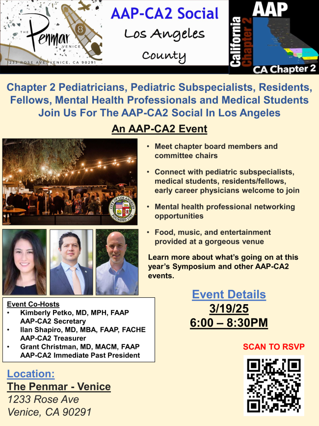 This issue is full of opportunities to engage and stay informed. There’s a new episode of the California Pediatrics Podcast, which includes details about the February 27 AAP-CA2 and Cal-MAP Think Like a Shrink mental health conference, as well as information on an upcoming town hall with Dr. Ken Saul. You’ll also find updates on rising measles cases, key Medi-Cal policy changes, and advocacy opportunities—including becoming a legislative key contact. And don’t miss registration links for upcoming social events in Los Angeles (3/19) and Santa Barbara (3/26), plus the newly opened Symposium event website.