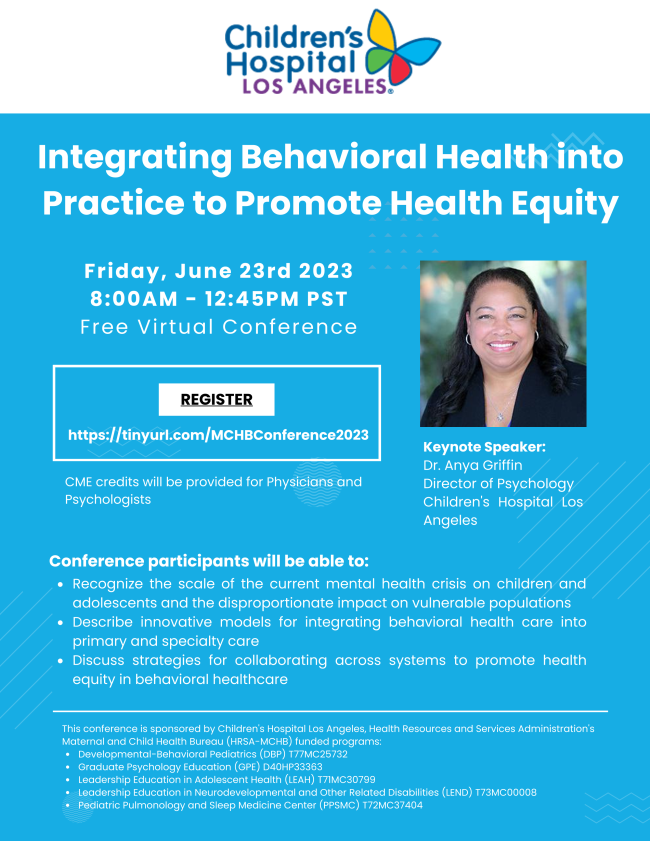- June 23 | Integrating Behavioral Health into Practice to Promote Health Equity Conference (CHLA)