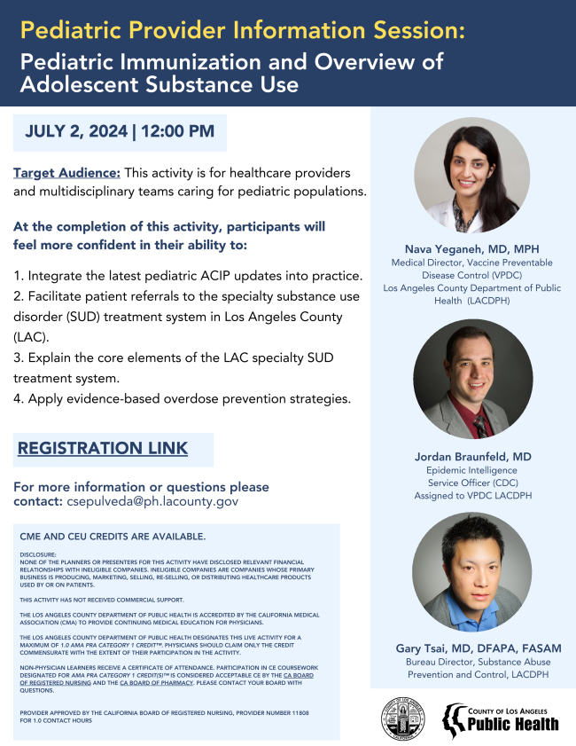 July 2 | Pediatric Provider Information Session: Pediatric Immunization and Overview of Adolescent Substance Use | |