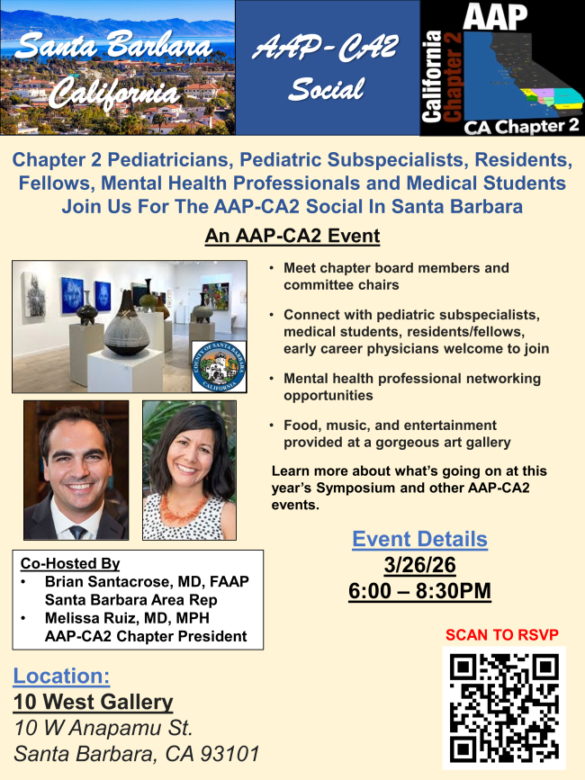Join us in Santa Barbara county for a chapter social! This event will be held on March 26th, at 10 West Gallery, a contemporary fine art gallery located in the heart of downtown Santa Barbara just 1/2 block from the Santa Barbara Museum of Art. We are inviting pediatricians, pediatric subspecialists, allied health professionals, nonprofit organizations, city and school officials, and legislators to attend. This will be an excellent networking opportunity accompanied by drinks, music, and entertainment. Please RSVP by clicking on the links below!