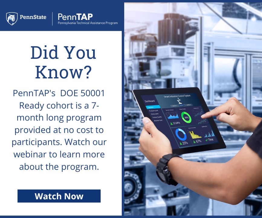 This spring, PennTAP will host two industry roundtables focused on Pollution Prevention (P2) tools and training needs that are unique to metals manufacturing and fabrication, as well as food and beverage manufacturing. The Metals Manufacturing and Fabrication Roundtable will take place at the Corner LaunchBox at Penn State New Kensington on May 10, and the Food & Beverage Manufacturing Roundtable will take place in the Gaige Building at Penn State Berks on May 24. Learn more and register.