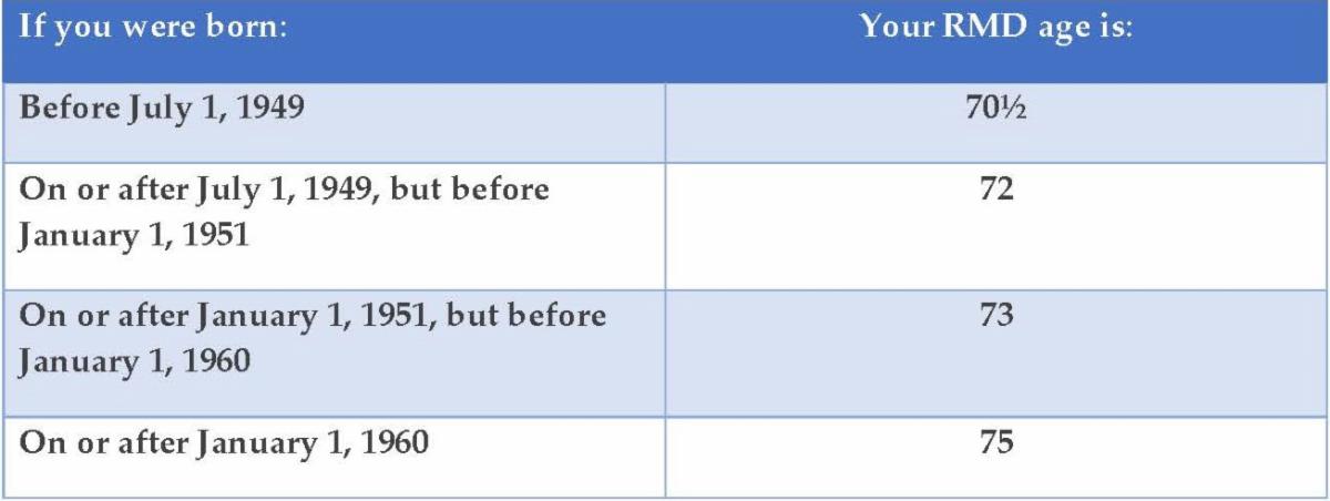 To summarize, the RMD ages as amended by the SECURE Act and SECURE 2.0 are: