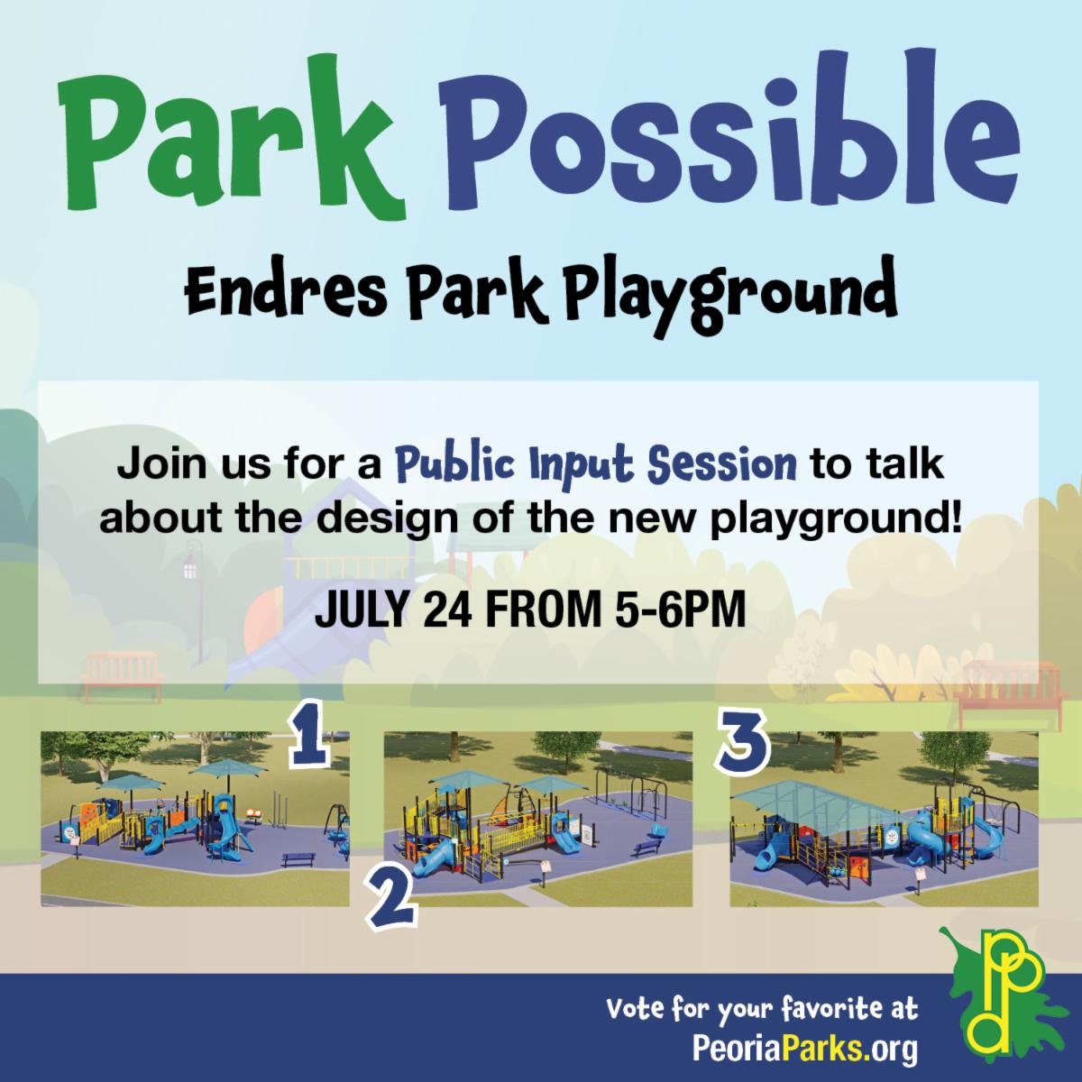 PEORIA, IL (July 17, 2025) – The Peoria Park District is inviting the public to help select a new playground design for Endres Park. District staff and Board of Trustees are asking community members to review three proposed concepts and provide feedback through an online survey open now through Monday, August 4.