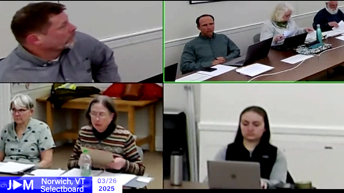 | | Pictured: Norwich Selectboard 3/26/25 | | This week's civic highlight: The Norwich Selectboard members discuss committee updates and town goals. Tune into JAM's coverage of this or your town's government and school board meetings live or pre-recorded @ UVJAM.ORG/WATCH | | |