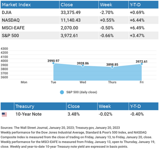 Stocks weakened to start the week amid discouraging corporate earnings and troubling economic data. Disappointing retail sales and manufacturing reports sparked concerns that the Fed may have gone too far in hiking rates, while a drop in initial jobless claims diminished chances of a near-term pause in rate hikes. Welcome news from two big technology names on Friday powered a strong rally that mixed significant indices.