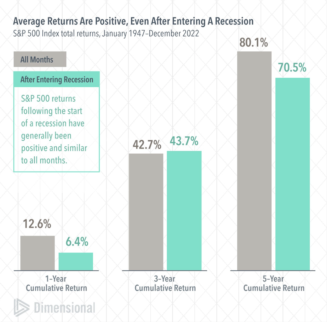 Yes, you read that correctly – average returns are POSITIVE, even after entering a recession. Just check out the graphic and info below from Dimensional if it seems unbelievable!