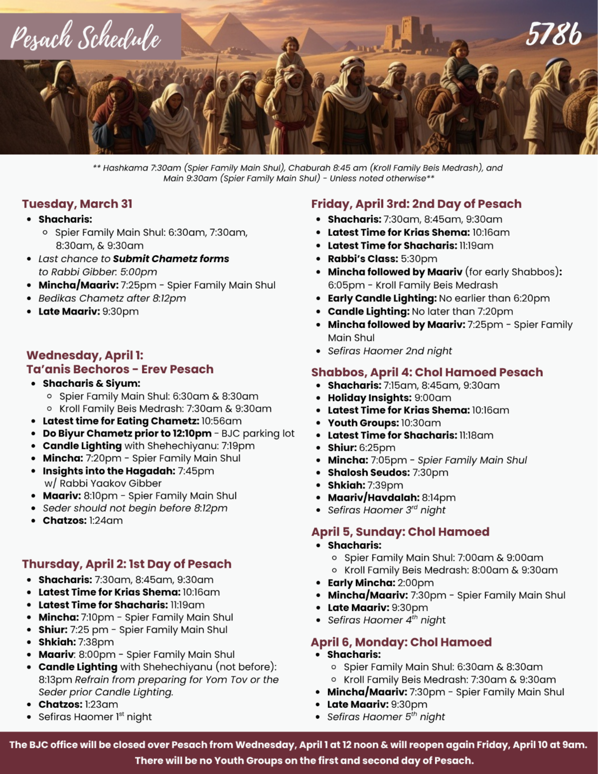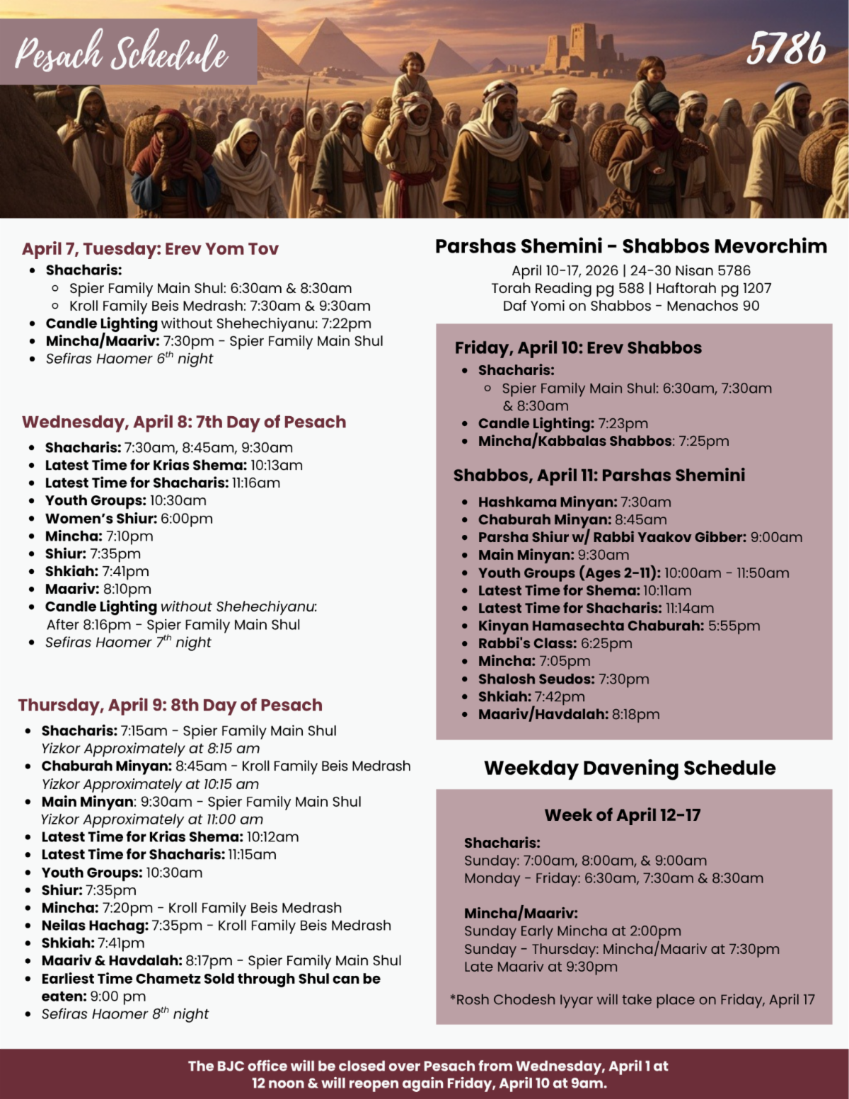 After the 7:30 am Shacharis, from now through Sunday, March 29.